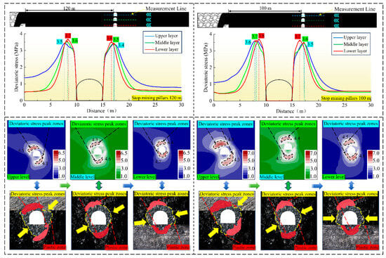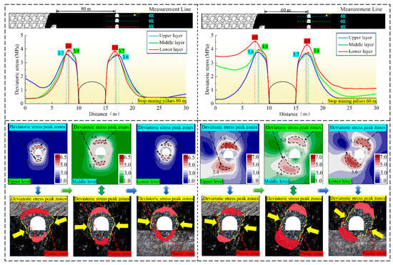 Under the influence of longwall-induced perturbations, the dynamic evolution law of DSPZ of the surrounding rock of the lower track roadway is: (a) When the stop coal pillar is x1 m, PVDSF on both sides of the track roadway is significantly different. The concentration of deviatoric stress on the lower side of the roadway is higher than that on the upper side, and DSPZ forms an asymmetric pattern. The spatial position of the two DSPZ is layer and asymmetric, and the upper DSPZ from the layer axisymmetric spatial position of the ideal lower DSPZ. At the same time, the two DSPZ show a tendency to develop in the direction of the crescent-like outer arc and deflect clockwise, forming the evolution form of “crescent-like layer asymmetry”; (b) When the stop coal pillar is x2 m, the concentration degree of deviatoric stress on both sides of the track roadway tends to be balanced, and DSPZ presents a quasi-symmetrical distribution, but the two DSPZ deviate from the ideal layer axisymmetric position, and both develop and expand along the crescent-like outer arc direction, accompanied by synchronous clockwise rotation, forming a “crescent-like non-layer symmetry” stress field distribution mode; (c) When the stop coal pillar is x3 m, DSPZ in the surrounding rock of the main roadway shows significant asymmetric characteristics-the peak stress on the non-mining side is attenuated. At the same time, the two DSPZ inherit the evolution law of the development of the outer arc direction and the clockwise rotation. However, due to the unilateral stress concentration strengthening effect, the “crescent-shaped unilateral deviatoric stress attenuation asymmetric” evolution form with asymmetric characteristics is finally formed.