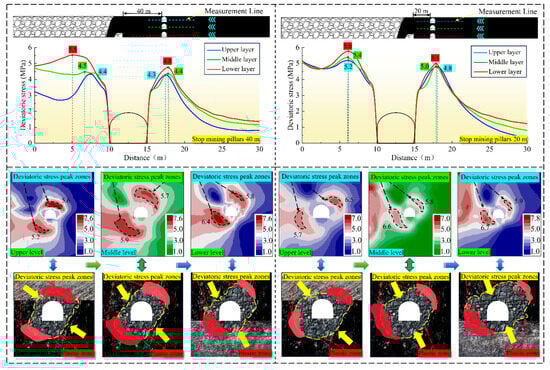 (1) With continuous working face advancement, PVDSF on the mining side and non-mining side of the roadway generally exhibit asymmetric loading characteristics. With diminishing protective coal pillar dimensions, the stress on both sides of the roadway increases. The unloading effect in the goaf area combined with pillar width reduction leads to stress concentration. Where pillar dimensions meet or exceed 60 m, PVDSF on both sides change minimally. When the pillar width is ≤40 m, these peak values increase sharply. The final pillar width significantly influences PVDSF of the roadway surrounding rock. Throughout the process, the peak deviatoric stress value on the mining side consistently exceeds that on the non-mining side.