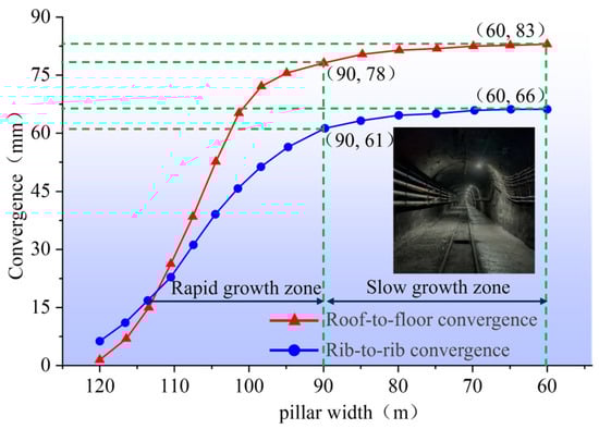To comprehensively evaluate the performance of the support structure under the proposed design and accurately determine the control effectiveness of surrounding rock with targeted reinforcement, displacement monitoring stations were established following roadway enlargement. As illustrated in Figure 17, after mining activities commenced, the convergence of the roof-to-floor and rib-to-rib in the track gateway increased rapidly. This rapid convergence subsided when the protective coal pillar width reached 90 m, defining the rapid convergence zone of the track gateway. As mining advanced and the protective coal pillar width was ultimately reduced to 60 m, the roof-to-floor and rib-to-rib convergence gradually stabilized. This phase represents the gradual stabilization zone of the track gateway convergence. Monitoring results of the track gateway displacement revealed a maximum floor heave of 52 mm, roof displacement of 31 mm, and rib displacement of 66 mm. Crucially, no failure occurred within the bolt-cable support system. The roadway achieved complete stability 50 days after mining cessation. These findings demonstrate that the proposed support design exhibits favorable applicability and effectiveness in controlling surrounding rock deformation, adequately fulfilling the ground control requirements.