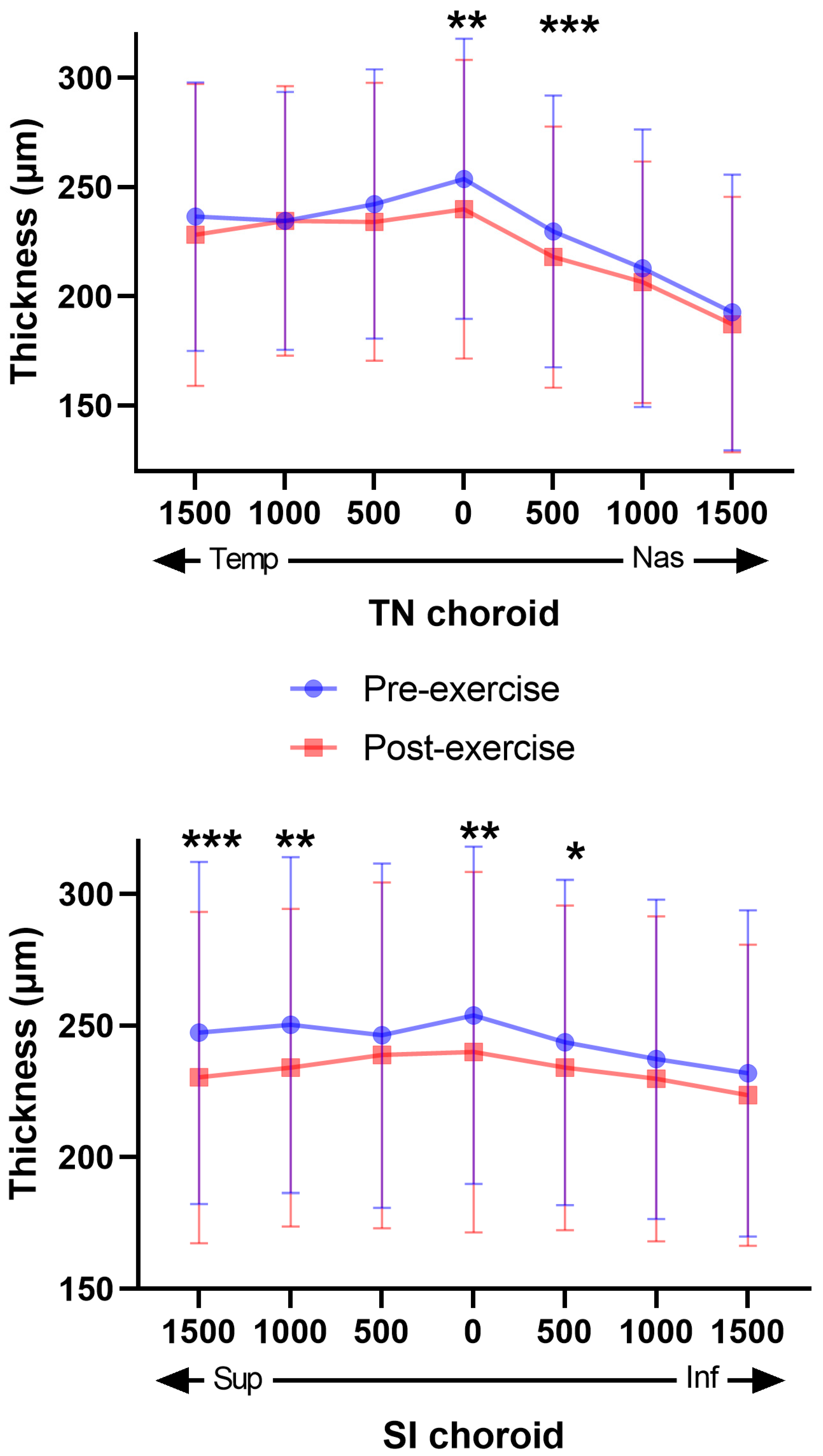 - Insa-Sánchez, G.; Fuentes-Broto, L.; Cobos, A.; Orduna Hospital, E.; Segura, F.; Sanchez-Cano, A.; Perdices, L.; Pinilla, I. Choroidal Thickness and Volume Modifications Induced by Aerobic Exercise in Healthy Young Adults. Ophthalmic Res. 2021, 64, 604–612. [Google Scholar] [CrossRef]