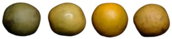 The fruits were classified into four visual maturity stages, as shown in Figure 1. Classification followed an adaptation of the USDA maturity guidelines and the methodology described by Jiménez-Cuesta et al. [40], based on peel color evolution during ripening: Class 1 corresponds to fruits with predominantly green skin; Class 2 to fruits transitioning from green to yellow; Class 3 to fruits mostly orange with residual green areas; and Class 4 to fully orange or dark orange fruits. Regarding morphology, the fruits were round to slightly oval, with medium-thick peel and a smooth to finely rough surface. Only fruits with uniform size, regular shape, and no visible external defects were selected to ensure homogeneity in the evaluations. Visual classification was performed by experts under controlled lighting and cross-validated with instrumental measurements, including the (CCI), soluble solid content (degree Brix), and firmness.