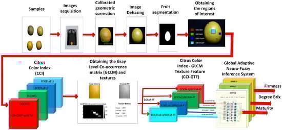Based on this development, a computer vision system and an ANFIS model were implemented to non-invasively estimate key internal parameters: maturity index, Brix, and firmness. This integrated approach aims to improve the accuracy, practicality, and scalability of citrus quality assessment for industrial applications. The research question guiding this study is as follows: Can the prediction of Brix content and firmness be improved using a CCI–GLCM-TF descriptor in an ANFIS-based model?