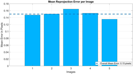 The parameters obtained included focal lengths and radial distortion coefficients and . The calibrated model was validated through three automatically generated figures. Figure 4 shows the Mean Reprojection Error per Image, reporting an overall mean error of 0.15 pixels. Figure 5 presents the Extrinsic Parameters Visualization, illustrating the spatial position of the pattern with respect to the camera system. Figure 6 displays the Undistorted Image with Geometric Center, where the original center is marked in red and the corrected center in green.