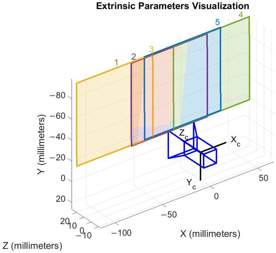 Extrinsic parameter visualization. Each color in the figure represents a distinct pose of the calibration pattern, corresponding to five different positions of the chessboard used during the calibration process.
