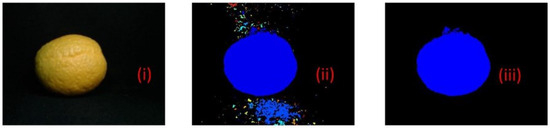The proposed method for segmenting the orange captured by the computer vision system: (i) image of the actual orange; (ii) sample binarization; and (iii) sample segmentation and noise removal for pixels smaller than 20,000.
