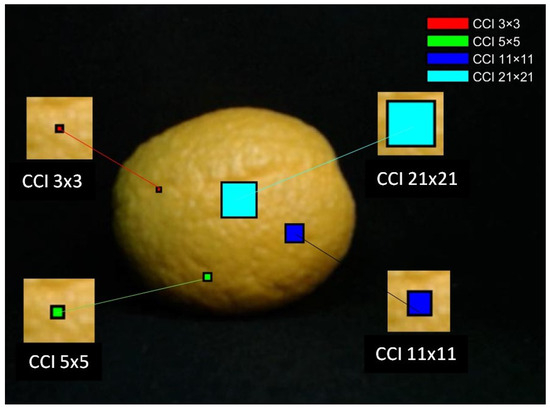 The proposed method for obtaining the region of interest (ROI) and calculating the (CCI) consisted of three stages [40]. First, four subregions of sizes 3 × 3, 5 × 5, 11 × 11, and 21 × 21 pixels [62,63,64,65] were extracted. The 21 × 21 pixel subregion was always positioned at the centroid of the fruit to ensure a representative central measurement. In addition, multiple subregions of smaller sizes (3 × 3, 5 × 5, 11 × 11) were obtained randomly across the fruit surface, under the constraint that they did not overlap and remained fully contained within the fruit boundary. This strategy ensured a balance between systematic (central) and stochastic (random) sampling, thereby capturing both global and local color variations, as illustrated in Figure 8. The use of multiple window sizes allows for the capture of both fine local color details (small subregions) and broader spatial variations (larger subregions), which is essential for accurately characterizing peel color and assessing fruit ripeness [50,51].