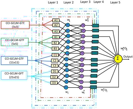 Finally, the eighth stage includes the design of the Global Adaptive Neuro-Fuzzy Inference System, which consists of three ANFIS models trained with the combined descriptors (CCI–GLCM–TF) to predict maturity, Brix degrees, and firmness. This approach enables nonlinear mapping of quality variables and rule-based fuzzy interpretation, providing an adaptive and interpretable solution for citrus evaluation.