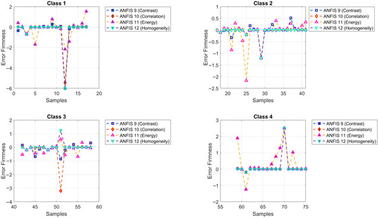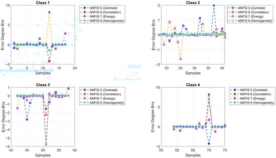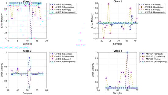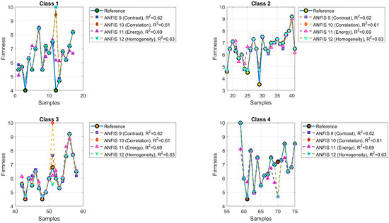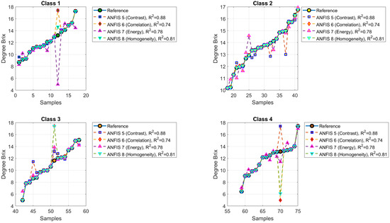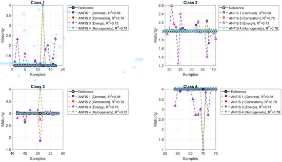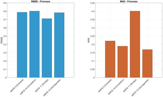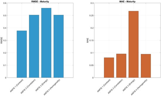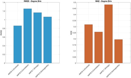 The ANFIS models developed in this study, combining the Citrus Color Index (CCI) with texture features derived from the Gray-Level Co-occurrence Matrix (GLCM)—including contrast, correlation, energy, and homogeneity—demonstrated reliable predictive capabilities for estimating maturity, degrees Brix, and firmness in oranges. As shown in Table 7, the coefficients of determination () ranged from 0.6089 to 0.8137, with moderate RMSE values, confirming the robustness of the models.