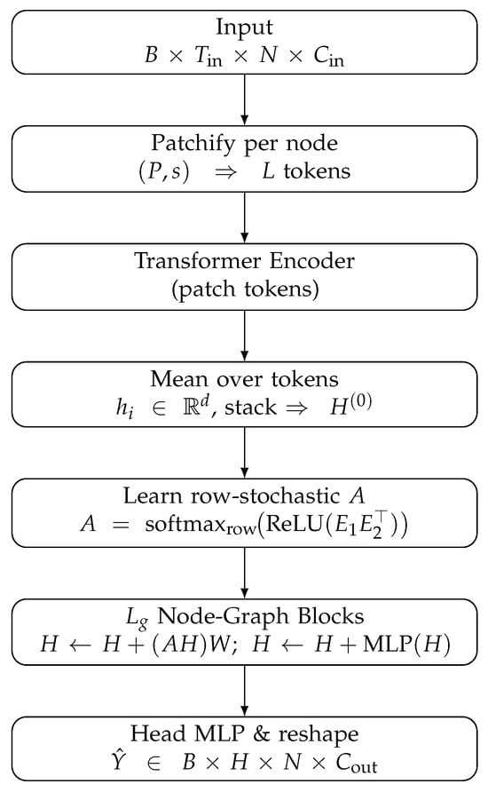 15], which constructs localized spatial-temporal graphs (within sliding time windows) to model synchronous traffic dynamics. By performing graph convolutions on these small joint space-time subgraphs, STSGCN was able to more effectively capture fine-grained traffic interactions and further improve short-term forecasting accuracy. These early GCN+RNN hybrids effectively incorporated road network topology for short-term forecasts but were limited by RNN’s accumulating errors over long horizons and reliance on a fixed, static adjacency matrix derived from physical distances.