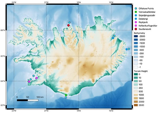 Geographical area investigated in this study. The map shows Iceland with terrain height and bathymetry information from GEBCO. Coastal meteorological stations are indicated by colored circle points (green—South, red—North, blue—East, purple—West), and study locations, approximately 10 km from the coast, are marked with hexagonal points. A legend is included to distinguish regions and features.