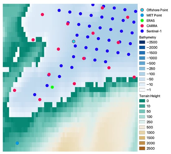 Over the study period, Sentinel-1 scenes were collected from locations approximately 10 km offshore across Iceland’s four coastal regions: North, South, East, and West, as illustrated in Figure 1. Figure 1 illustrates Iceland’s terrain and bathymetry, along with meteorological stations marked by colored circles and offshore study locations indicated by hexagons. These points were selected to capture diverse wind conditions influenced by regional geographic and climatic variability. Additionally, the chosen locations align with meteorological stations that provide monthly average wind data for the years used in the study. Table 1 summarizes the most essential characteristic differences in the datasets used in this study.