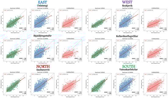 Scatterplots comparing wind speed data among Sentinel-1, ERA5, and CARRA for various study points across the North, South, East, and West of Iceland. The comparisons include Sentinel-1 versus ERA5, Sentinel-1 versus CARRA, and ERA5 versus CARRA. The plots also display the linear regression parameters (slope and intercept), as well as evaluation metrics such as RMSE (expressed in m/s) and Pearson correlation coefficient, to assess the agreement and divergence between the datasets.
