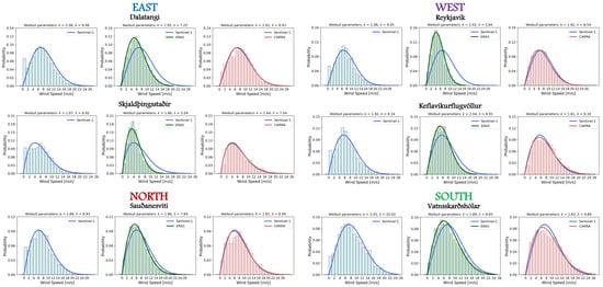 Figure 4 compares the Weibull probability density function (PDF) with observed wind speed histograms from three different data sources: Sentinel-1, ERA5, and CARRA, across multiple study points located along the coast of Iceland. These study points are organized into four regions: North, South, Eastern, and Western. The purpose of the graph is to visually assess the differences and similarities between the wind speed distributions obtained from the three wind speed sources and to display the corresponding shape and scale parameters of the Weibull distribution for each dataset and study point.
