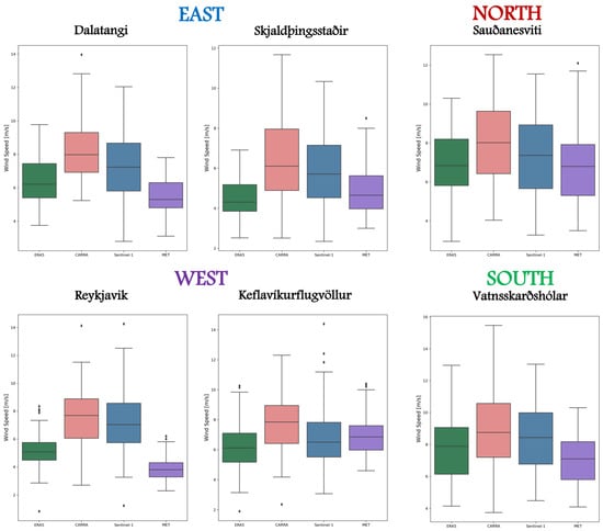 The Icelandic Meteorological Office provides monthly average wind speeds from stations located on the coast, while the points for the other data sources, namely ERA5, CARRA, and Sentinel-1, were extracted approximately 10 km from the coast. Consequently, we expect variability between the MET observations and the other sources, driven mainly by complex terrain and coastal effects. Moreover, previous studies suggest that ERA5 tends to underestimate wind speeds, so we assume it should align more closely with MET values [26,28].