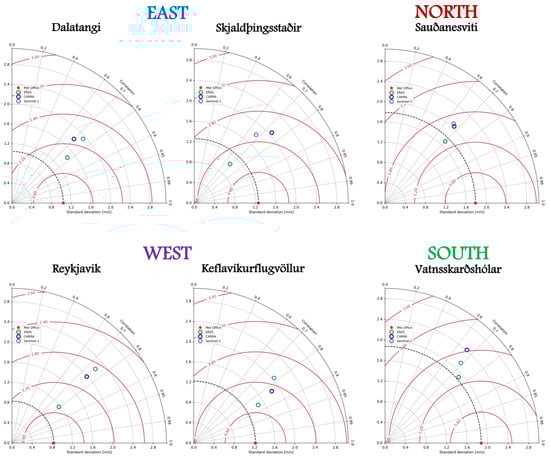 The North point is particularly noteworthy, as all sources demonstrate relatively similar performance, clustering closer to the reference source on the Taylor diagram. This suggests that in this region, differences between the datasets are less pronounced, possibly due to more uniform terrain or wind conditions.