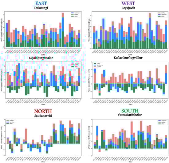 CARRA consistently demonstrates the largest differences across all locations, with particularly noticeable positive anomalies. This pattern suggests a tendency to overestimate wind speeds relative to the reference source, making it the least accurate. Sentinel-1 exhibits moderate differences, generally falling between ERA5 and CARRA; while it also overestimates wind speeds, its deviations are less pronounced than those of CARRA, showing a more balanced performance. ERA5 stands out as the closest to the MET reference, with the smallest differences across most points. Its slight underestimation of wind speeds results in discrepancies that align more closely with MET values.