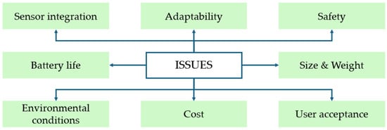 To develop an effective solution, it is necessary to analyze the issues and requirements. The design of a guide robot for blind and elderly people requires consideration of several aspects, as pointed out in [39]. One of the main issues is the integration of advanced sensors that allow the robot to detect obstacles, terrain changes, and dynamic situations in real time. These sensors must provide reliable data that allow the robot to react appropriately to different environmental scenarios, thus ensuring the user’s safety while moving. In addition, each user has different needs, preferences, and abilities, so the robot must be able to adapt and provide a personalized experience. Safety and autonomy are fundamental factors for blind and elderly people to be able to move independently and confidently in their environment. In addition, a guide robot must provide sufficient autonomy to travel long distances without the need for frequent battery recharging. The mechanical design of the robot is also important. A bulky or overly heavy robot could make it difficult to transport and use, becoming a barrier rather than a solution. In addition, it must be robust and functional in a variety of environmental conditions. Another basic feature is that the robot should be available at an affordable cost. Finally, social acceptance of the robot is a determining factor for its acceptance. It is essential to consider how assisted individuals perceive their interactions with robots and how their confidence in the system influences their willingness to use it in their daily lives. Figure 1 summarizes the issues to consider when designing a guide robot for blind and elderly people.