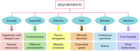 In terms of requirements, the robot must be user-friendly, which implies a natural and accessible interaction with users. It must also be adaptable to the individual needs of each user. Its operation must be efficient and perform its primary function of assisting mobility with precision, even in changing environments. It must also ensure user safety and prevent accidents by protecting the user from potential hazards in the environment. It must also be reliable, ensuring consistent and robust operation at all times. Finally, it must be intuitive with a simple user-friendly interface. Figure 2 summarizes those requirements to be considered when designing a guide robot for the elderly and blind.