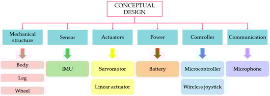 The mechanical structure includes the robot body and the locomotion unit, which is specifically designed as a hybrid system of legs and wheels. This configuration is designed to allow the robot to better adapt to environment, move efficiently over different types of surfaces and obstacles. The sensory system consists of an IMU that provides data on the robot’s orientation, acceleration, and relative position. This information is fundamental for maintaining stability and adjusting motion in real time. As for the actuators, the system includes a combination of rotary servomotors and linear actuators, which are responsible for generating the movement of the robot, either to move, stabilize or perform actions related to interaction with the environment or with a user. The power supply system is based on a rechargeable battery that acts as a power source for all the modules of the system. The control module consists of a microcontroller and a wireless joystick that can help also the voice-based controlled operation. Finally, the communication system integrates a microphone to receive and process voice commands from a user. Overall, this modular design allows for scalable and adaptable development to meet the specific needs of users. It also lays the foundation for future integration of more advanced systems. This includes the integration of advanced AI algorithms for route planning and autonomous decision making, autonomous navigation systems based on more complex sensors (such as cameras and LiDAR), and multisensory feedback mechanisms (haptic, visual) to enrich the user–robot interaction and improve the perception of the environment. The modularity of the design allows functional blocks to be added or modified with minimal impact on the overall architecture, promoting the continuous evolution of the guide robot.