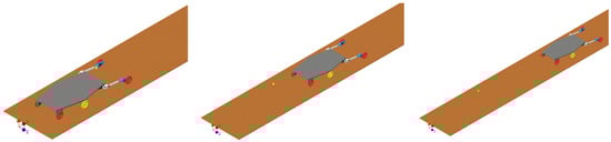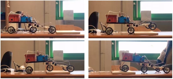 Figure 10 shows a snapshot from an experimental test in which the redesigned prototype successfully overpasses a 20-mm-high step. The first image shows the robot approaching the step while keeping its platform horizontal. The second and third images depict the coordinated deployment of the front legs’ linear actuator, which raises the front wheels and positions them over the obstacle. The fourth image shows the rest of the robot body ascending stably, with the platform preserving its horizontal orientation throughout the maneuver. This performance is attributed to optimal mass distribution, triangular support configuration, and optimized wheel traction, which ensure continuous movement and robust stability when overcoming obstacles. Figure 9b shows the robot overcoming a 40 mm high step which corresponds to the kinematic limit of the leg–wheel assembly and the available actuator torque. Beyond this height, slippage and loss of stability were observed preventing the obstacle overpassing. In Figure 10 the prototype overpasses successfully a 20 mm obstacle with success rate of 100% of 10 tests while Figure 9b shows a successively overpassing of an obstacle of 40 mm with a success rate of 40% from 10 tests yet.