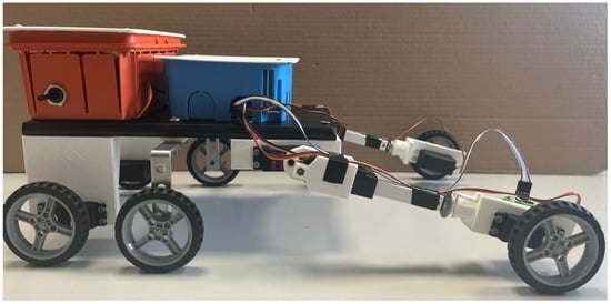 Figure 8 shows the prototype of the guide robot built at LARM2 (https://larm2.ing.uniroma2.it/, visited on 15 September 2025). The central platform structure, made of plastic and rectangular geometry, has been adapted with squares that give it a shape similar to the hexagonal geometry of the conceptual design. This structure houses electronic components and battery. The prototype’s layout shows the spatial distribution of the subsystems and the feasibility of the hybrid locomotion concept.
