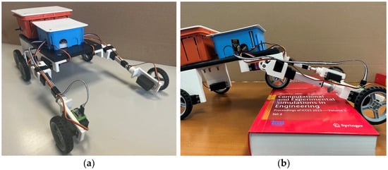 After an experimental evaluation of the initial prototype shown in Figure 8 through straight-line displacement and obstacle-overcoming tests, stability issues related to the mechanical configuration were identified. The tests revealed that the system’s center of gravity displaced towards the front leg relative to the geometric center of the platform. This misalignment resulted in three main operational limitations, namely the following: