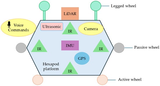 Figure 11 aims to illustrate the layout and physical integration of different sensors in the prototype design. However, details on accuracy data for the LiDAR and IMU are not included, since the scope of the paper focuses on the mechanical design and feasibility of the hybrid locomotion system.