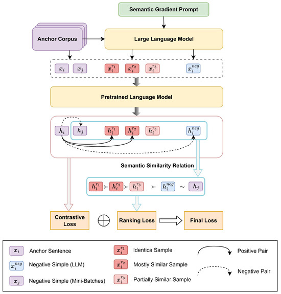 where denote the set of all negative samples. Meanwhile, a rule-based approach is employed during the data generation process to assess the quality of the generated text. If the output is incomplete or its length deviates by more than 50% from the anchor sentence, the model is prompted to regenerate the text. The well-defined ranking effectively captures the monotonic decline in semantic relevance, thereby providing clear and informative supervisory signals for model training. The ranking objective can be defined as