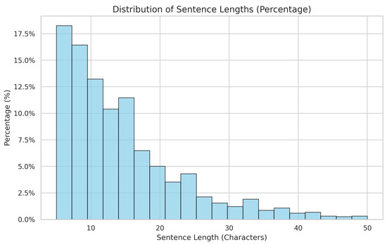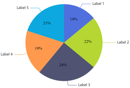 To guarantee annotation quality, we adopt a three-stage annotation process. Each stage strictly adheres to the annotation guideline outlined in Table 2. First, in the pre-annotation phase, we prompt DeepSeek to perform preliminary classification of text pairs, automatically determining their semantic similarity categories. Next, in the manual annotation phase, five annotators with expertise in classical literature, each having undergone systematic training on annotation guidelines, independently validate the pre-annotated results. Finally, a professional review panel resolves discrepancies between model pre-annotations and human annotations. For cases where consensus cannot be reached, domain experts make the final adjudication to ensure the accuracy of the annotated results. Given that differences in textual interpretation may lead to inconsistencies, we assess inter-annotator agreement using Fleiss’ Kappa [29], which yields a score of 0.83. According to the criteria established by Richard et al. [30], a Kappa value between 0.81 and 1.00 denotes almost perfect agreement, indicating a high level of consistency among annotators in our study. As shown in Figure 2, the sentence length distribution within the constructed dataset demonstrates a clear concentration of textual units in the 5–20 character range, which aligns with the characteristically concise nature of classical Chinese literature. A gradual decline is observed for longer sentences (>20 characters), with minimal representation beyond 50 characters, consistent with the stylistic conventions of historical philosophical works. And the class distribution of the dataset is illustrated in Figure 3, showing an overall balanced distribution across categories. Notably, Label 2 accounts for the largest proportion, which may be attributed to the fact that citations in philosophical texts often involve not merely verbatim repetition but rather semantic transformation and creative reinterpretation.