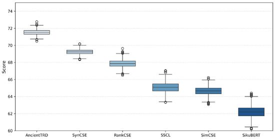 - The AncientTRD model demonstrates superior performance across all evaluation metrics. Quantitative analysis shows that AncientTRD achieves remarkable improvements of 14.92% and 14.36% over the original SikuBERT and SikuRoBERTa architectures, respectively. Furthermore, when compared with the current state-of-the-art data distillation method, SynCSE, AncientTRD still maintains a clear advantage, with performance enhancements of 3.34% and 3.25%. Notably, models based on the SikuBERTbase architecture generally outperform those using the SikuRoBERTabase architecture.