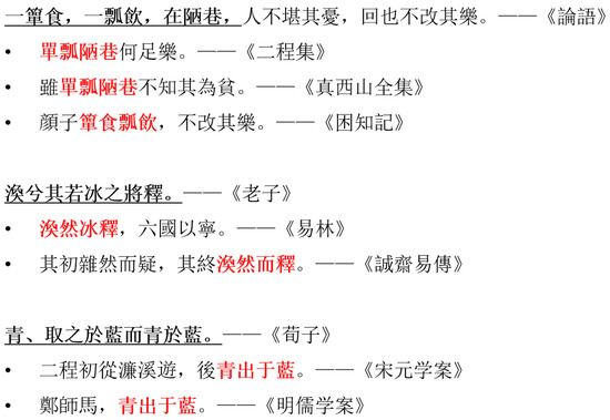 The application of AncientTRD to allusion tracing. Examples are presented in Chinese. Reused text is highlighted in red for underlined phrases.