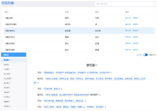 Building upon the work presented in this study, we have developed an online platform (https://ca.pkudh.net, accessed on 5 June 2025) tailored for humanities research. The platform incorporates the full texts of 244 classical Chinese philosophical works, which are available for users to browse directly, as shown in Figure 7. Based on these primary sources, our proposed algorithm processes the original texts to construct a core corpus of over three million pairs of parallel texts with reuse relationships. In addition, the platform supports querying of original passages and multi-level semantic unit analysis. These analytical functions enable humanities scholars to systematically trace the evolution of intellectual and cultural ideas, identify intertextual connections, and uncover potential research trends and phenomena. In this section, we present a case study to demonstrate the platform’s applicability and value in advancing humanities research.