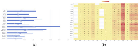 The application of AncientTRD to the analysis of literature influences. (a) Citation intensity of each chapter in the Analects. (The vertical axis represents the titles, and the horizontal axis represents the citation intensity—the longer the bar, the higher the citation intensity.) (b) Diachronic distribution of citation intensity across chapters in the Analects. (The vertical axis represents the titles, the horizontal axis represents dynasties, and colors closer to red indicate higher citation intensity).