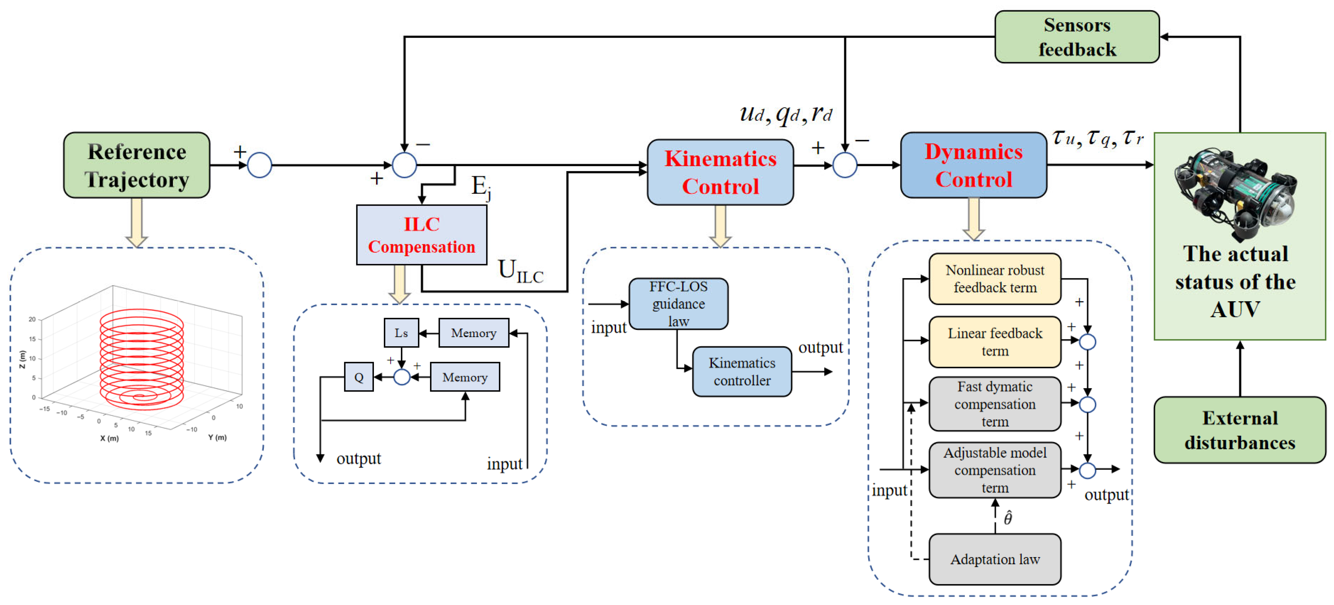 - Zhang, Z.; Lin, M.; Li, D. A Double-Loop Control Framework for AUV Trajectory Tracking under Model Parameters Uncertainties and Time-Varying Currents. Ocean Eng. 2022, 265, 112566. [Google Scholar] [CrossRef]