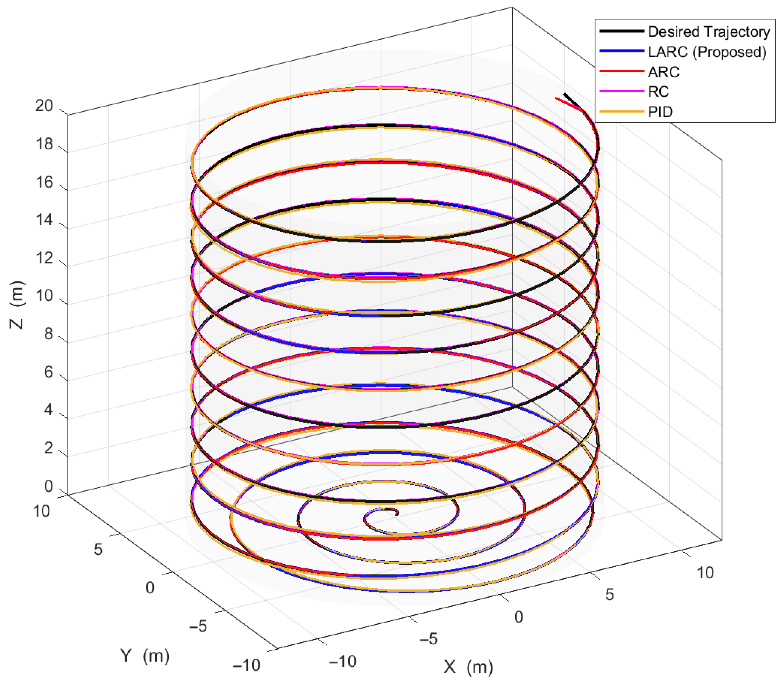 | LARC (Guo et al. [26]) | General 3D Trajectory | High (RLS + Robust Term) | Yes (via ILC) | Model-based + past trial data | UUB |