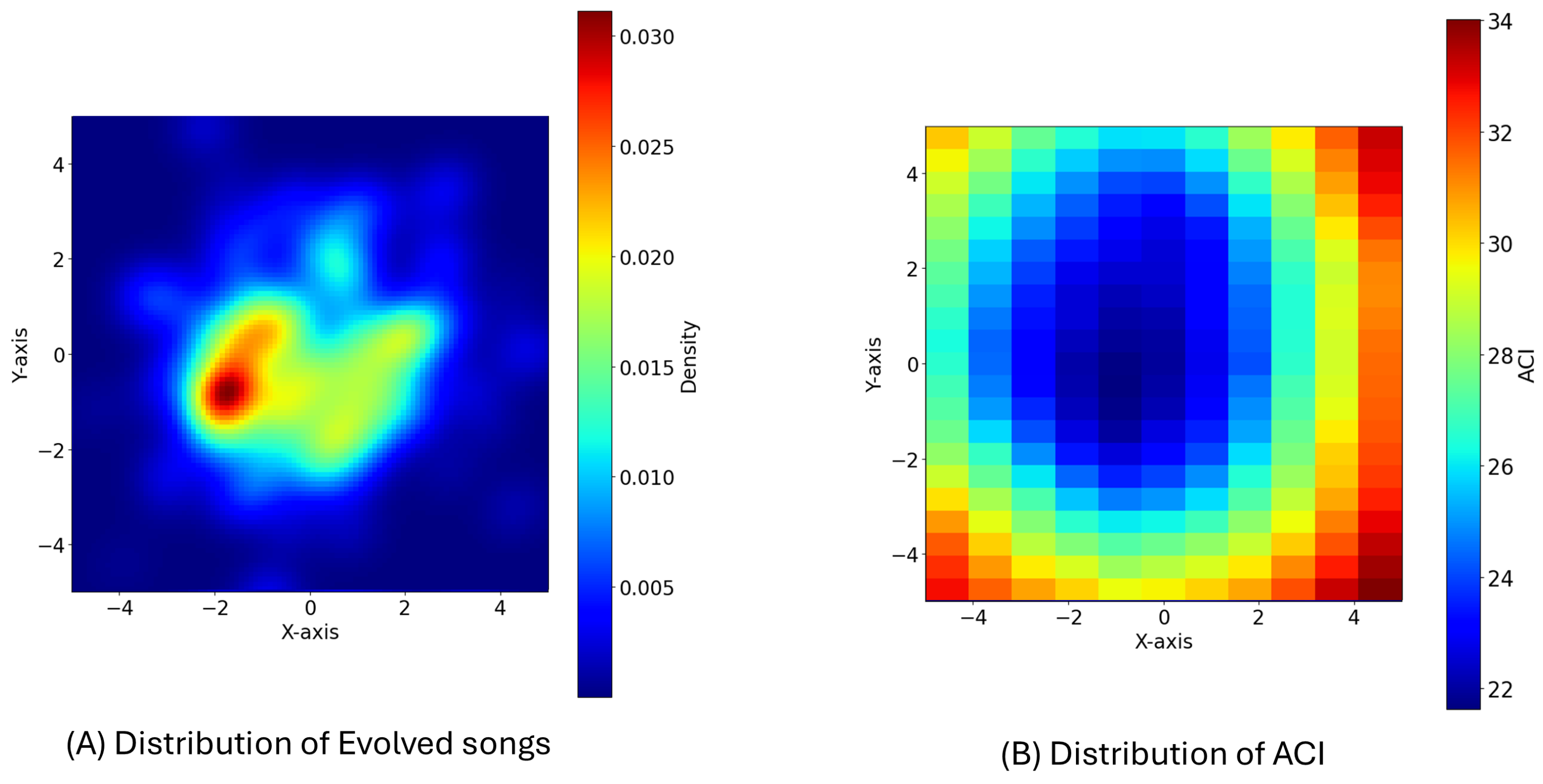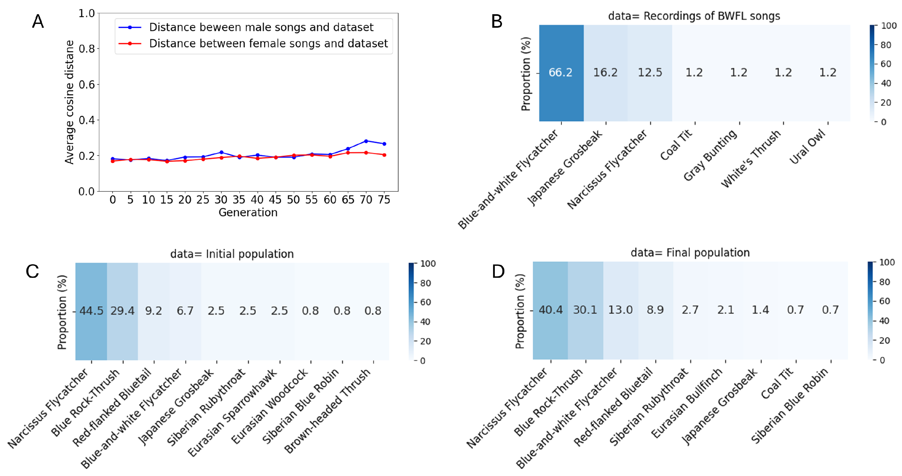 5.3. Species-Specific Acoustic Characteristics in Evolved Songs