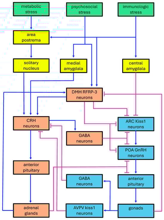 - Phumsatitpong, C.; Wagenmaker, E.R.; Moenter, S.M. Neuroendocrine interactions of the stress and reproductive axes. Front. Neuroendocr. 2021, 63, 100928. [Google Scholar] [CrossRef]