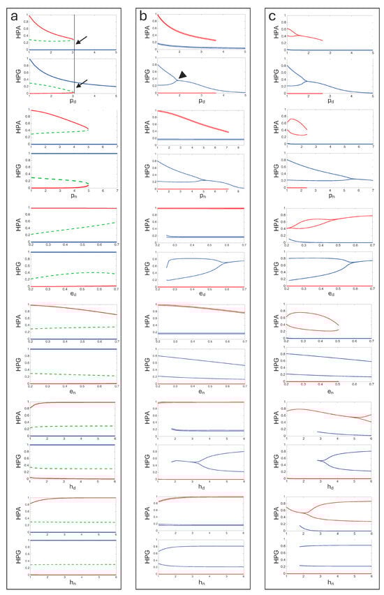 Demori, I.; Siriya, S.; Burlando, B. Loop Modeling of the Reciprocal Inhibition Between HPA and HPG Endocrine Axes Reveals Transitions to Bistability and Critical Bifurcation Parameters. Appl. Sci. 2025, 15, 10483. https://doi.org/10.3390/app151910483