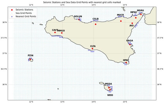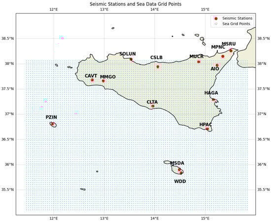 Similarly to what was described by Minio et al. [10], seismic and sea state data from January 2018 to December 2021 were collected from the European Integrated Data Archive (EIDA) Seismic Network ‘IV’ [11] and the Copernicus Marine Environment Monitoring Service (CMEMS) MEDSEA_MULTIYEAR_WAV_006_012 [12], respectively. Additional seismic records for Malta’s WDD and MSDA stations were obtained via the University of Malta. These Maltese stations were included to extend the geographical scope and contextual relevance of the study. Seismic data was sourced through the INGV network on EIDA [11], while sea state data came from CMEMS [12]. Fourteen seismic stations in total were considered, spanning Sicily, Pantelleria, and Malta. The region of interest is depicted in Figure 2.