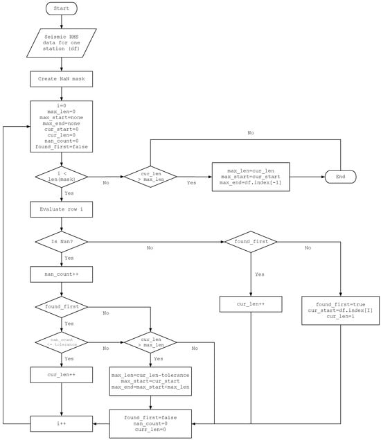 To avoid the information loss of using distant and poorly correlated sea state data, each seismic station is paired with its five nearest sea grid points highlighted in Figure 2. This pairing is established using distance calculations within a narrow radius of each station. To identify the longest continuous stretch of data for each station, a dynamic data selection algorithm was developed. The core idea is to traverse the time series data of each station and locate the segment with the maximum length of consecutive non-missing (non-null) data. This allowed for occasional small gaps, which are eventually filled via linear interpolation. A variable threshold is used, representing the maximum number of consecutive null values that are to be tolerated within an otherwise continuous segment. For instance, a threshold of four allows up to four consecutive null values to be treated as part of a continuous valid segment. The algorithm operates as follows, and is shown as a flowchart in Figure 3: