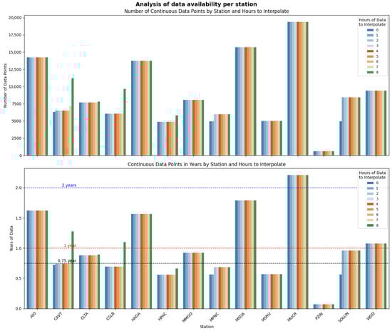 Figure 4 illustrates how the number of available data points for each station increased with higher interpolation thresholds. For example, by interpolating gaps of up to eight hours, the number of data points for station CAVT increases from 7142 to 11,201, surpassing the one-year threshold required for inclusion in subsequent analysis. Similarly, station CSLB met the inclusion criteria after allowing up to eight hours of interpolation, with its data count rising from 6058 to 9636 points. This contrasts with the methodology employed by Minio et al. [10], where up to 5000 data points (corresponding to 208 days worth of data) were interpolated.