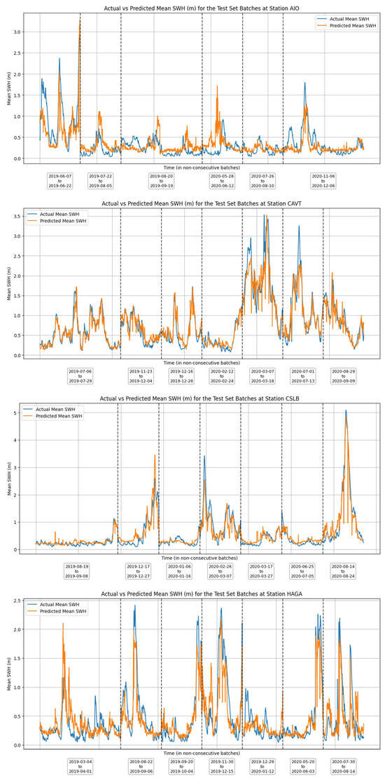 Within the recreated baseline, the strongest result was achieved at CSLB (R2 = 0.868, MAE = 0.137 m), shown in Table 3. These are comparable to Minio et al.’s [10] best results (R2 = 0.89, MAE = 0.21 m). Across all stations, a mean R2 of 0.697 and mean MAE of 0.161 m is observed, indicating slightly lower peak performance but higher average accuracy. The average results are heavily impacted by substantially poorer performance at stations AIO and MMGO. The RMSE consistently exceeds the MAE, indicating the presence of outliers.