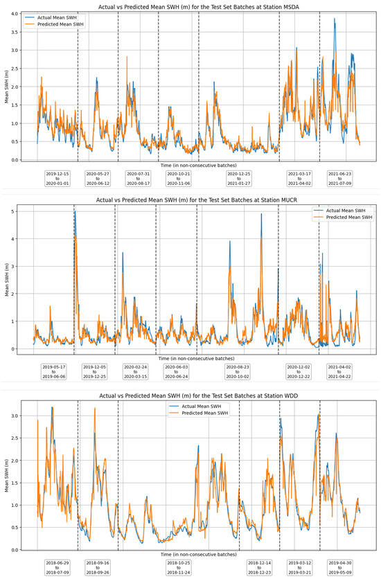 Five-fold cross-validation assesses the generalisability and robustness of the optimal RF models selected for each station, using hyperparameters derived from prior tuning. This procedure confirms a strong predictive relationship between seismic RMS values and SWH, with varying degrees of success across stations. Figure 6 and Figure 7 show the predicted and actual time series of SWH across all seven stations at different time periods, covering all seasons.