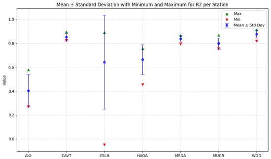 Mean, standard deviation, minimum and maximum R2 from K-fold cross validation per station.