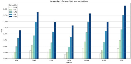 A common challenge observed across stations is the underestimation of peak SWH during extreme sea conditions, which occurred during summer periods, such as station MSDA at time period 2021-06-23 and in winter periods, such as station MUCR at time period 2019-12-05 to 2019-12-25. These examples are shown in Figure 7. This outcome is likely influenced by the limited representation of extreme wave events in the training data. To investigate this further, the SWH records at each station are segmented by key percentiles (25%, 50%, 75%, 90%, and 95%). As shown in Figure 9, stations such as CAVT, MSDA, and WDD exhibit broader SWH distributions, with their 95th percentile values lying within the 1.75–2.0 m range, and WDD extending just beyond 2.0 m. In contrast, AIO, CSLB, HAGA, and MUCR have more compressed distributions, with their 95th percentiles contained within 1.5 m. These patterns highlight that high wave events were relatively rare, particularly at the latter stations, where most observations remained confined to lower ranges.