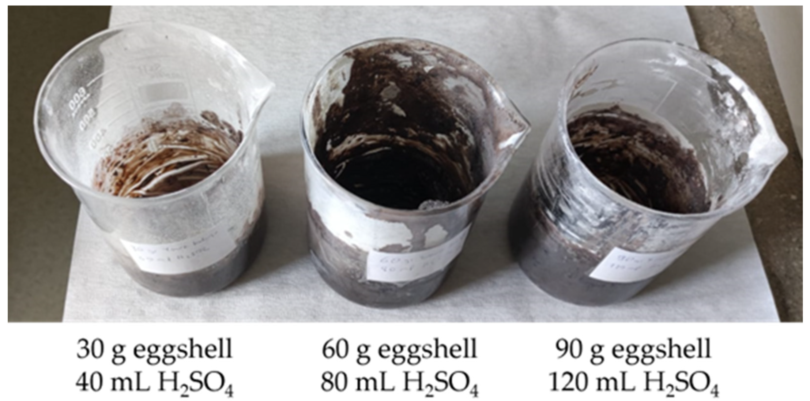 Heated and ground eggshell waste was first mixed with H2SO4. The process of mixing eggshell with H2SO4, which is selected as the catalyst material, is shown in Figure 2.
