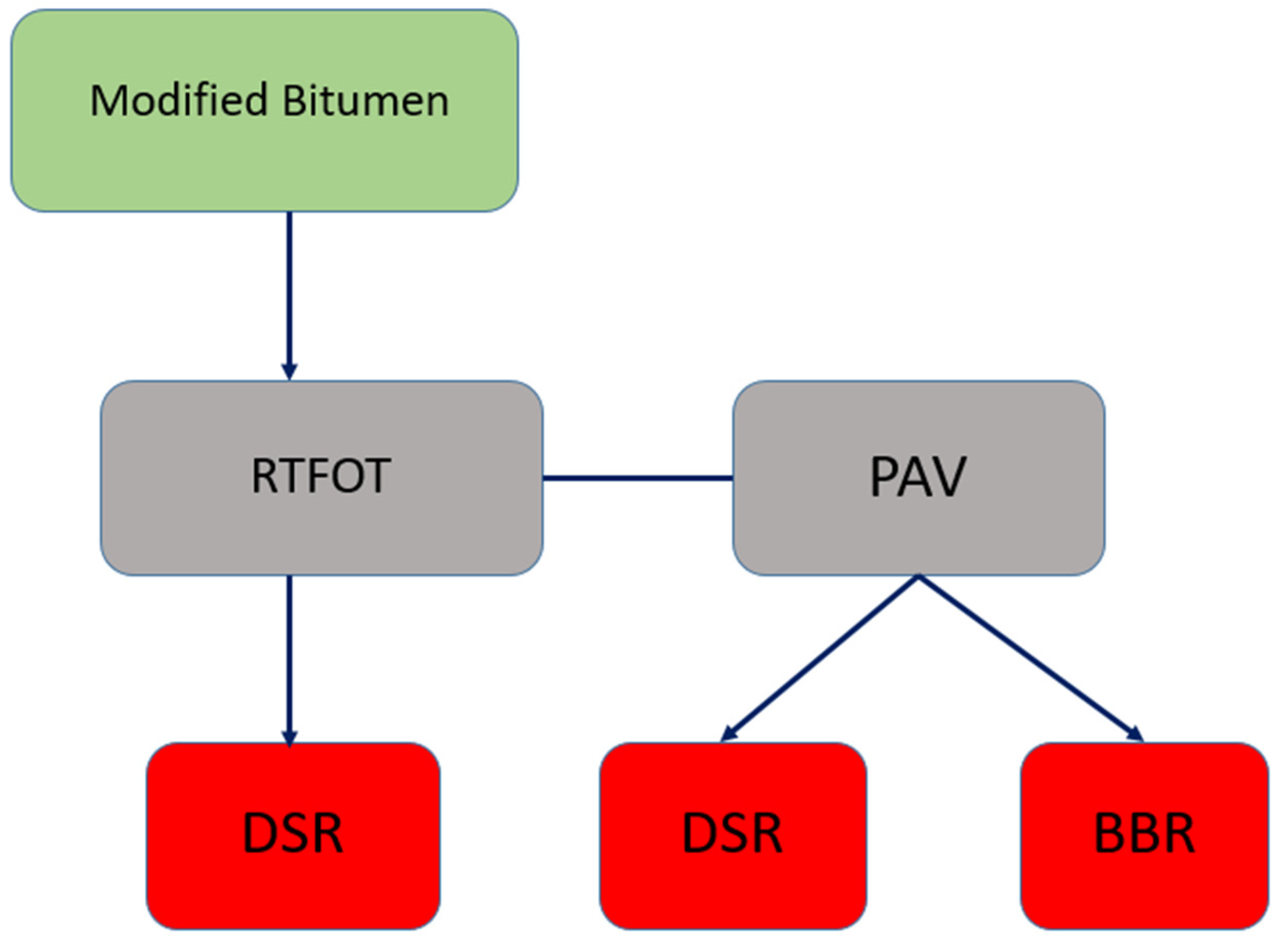 When Figure 4 is examined, the aging process was first applied to modified bitumen with the RTFOT test. Then, DSR performance tests were performed on the samples, and the results were given. Then, the PAV test was applied to the modified bitumen. After the PAV test, DSR tests were performed once more. Finally, PAV and then BBR tests were also performed on the modified bitumen. The gray boxes show the aging methods of the modified bitumen, and the red boxes show the performance tests. RTFOT was used as the short-term aging method. The PAV test was used as the long-term aging method.