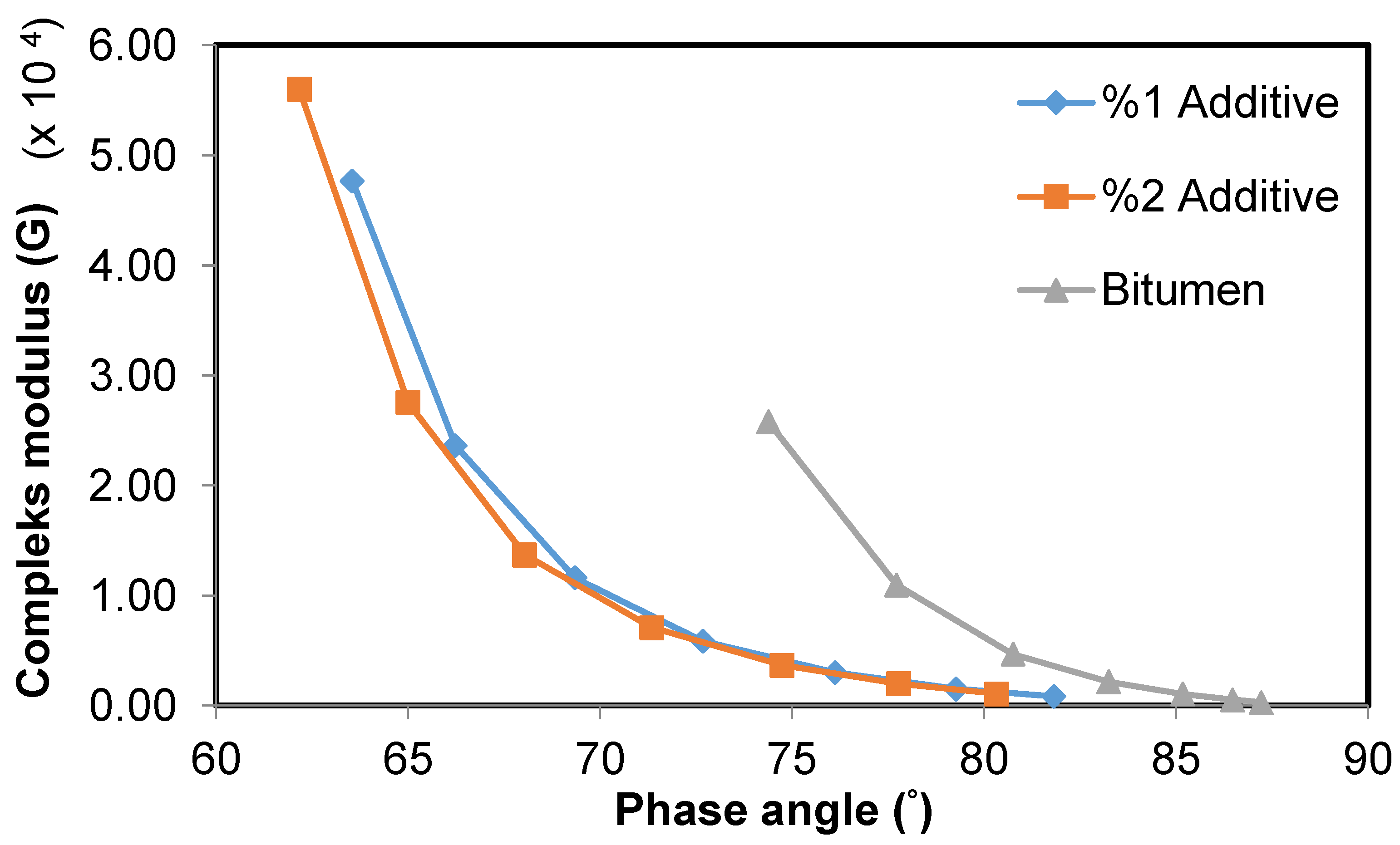It was observed that modified bitumen has lower phase angle values and higher complex shear modulus values than pure bitumen. This shows that modified bitumen exhibits more elastic behavior than pure bitumen.