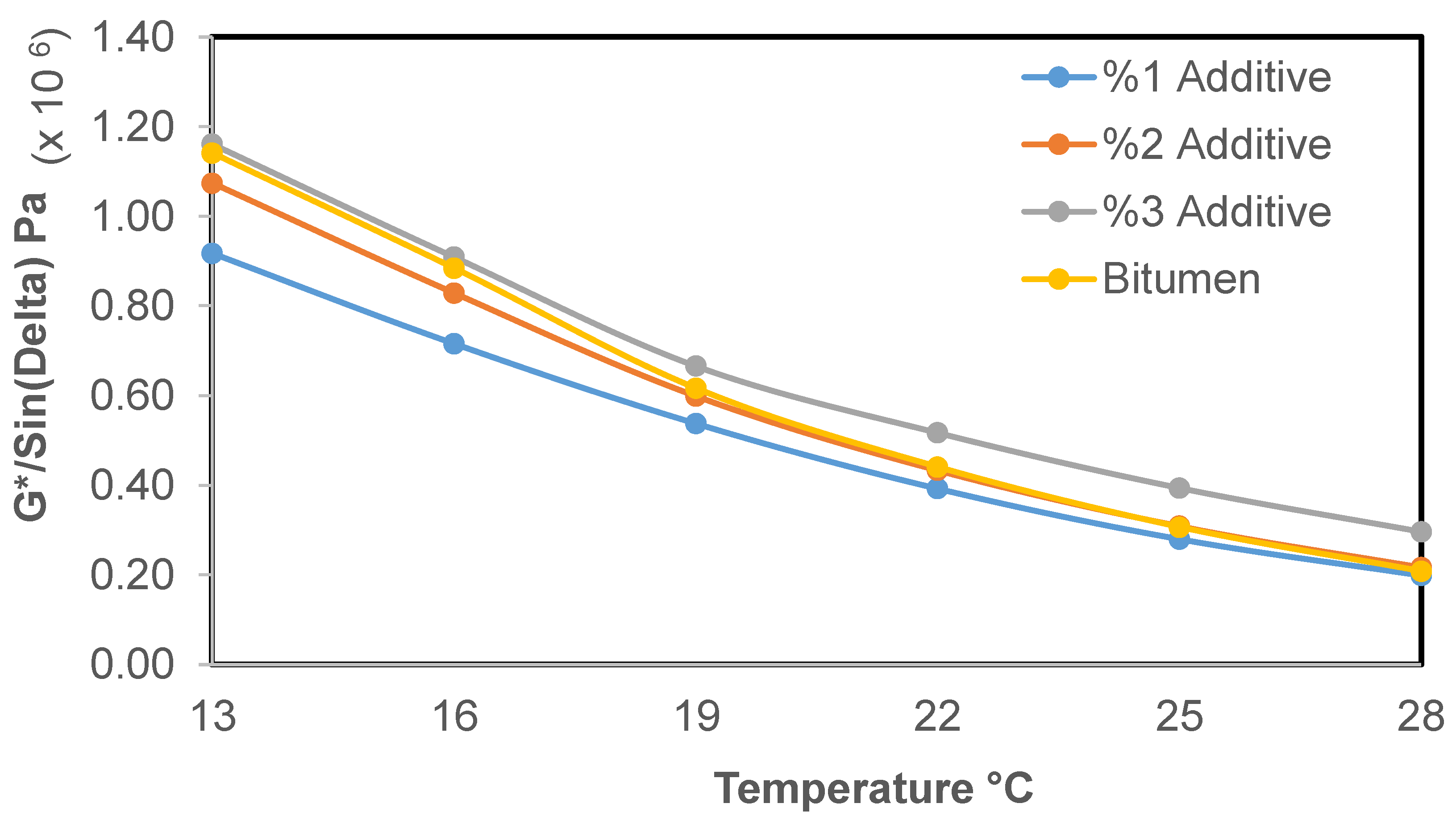 Figure 7. G*/sin(δ)–temperature change graph after RTFOT.