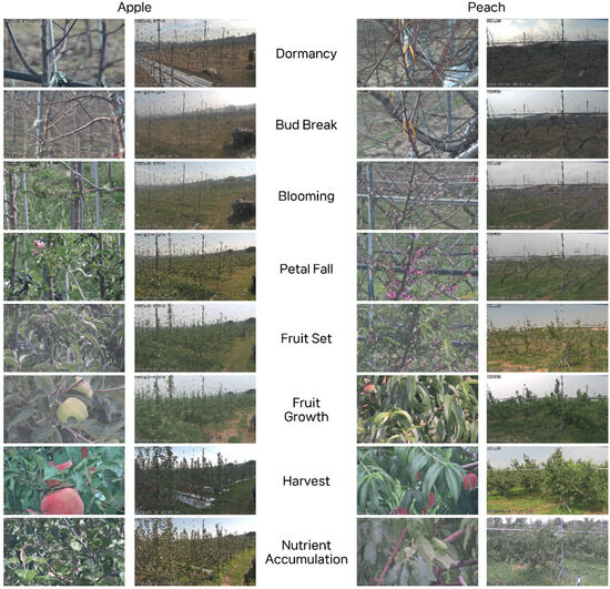 In this study, apples and peaches were selected as the data categories to develop a model for identifying weather damage to crops. These data were provided by the Rural Development Administration of South Korea. The collection process involved installing an AWS equipped with cameras on farms where apples and peaches were grown, allowing for automatic periodic photography. Peach data were collected in 2019 from the Icheon and Cheongdo regions and in 2020 from the Naju, Namwon, Imsil, Jangseong, and Jeonju regions. Apple data were collected from the Jangsu, Yeongju, Gunwi, Chungju, and Geochang regions in 2019 and 2020. The collected data encompassed the various growth stages of the crops, which were categorized into eight stages: dormancy, bud stage, flowering, post-flowering, early fruit growth, fruit growth, harvest, and nutrient accumulation. This categorization includes the entire process, from plant growth and energy accumulation to dormancy, allowing for a precise analysis of weather damage impacts at each stage. Figure 2 presents example images of apple and peach crops collected at various stages of growth. Each column represents the condition of the crops at a specific point in time, showing seasonal progression from dormancy to harvest. This visualization supports the detection of abnormal patterns by highlighting the temporal variation in crop appearance.